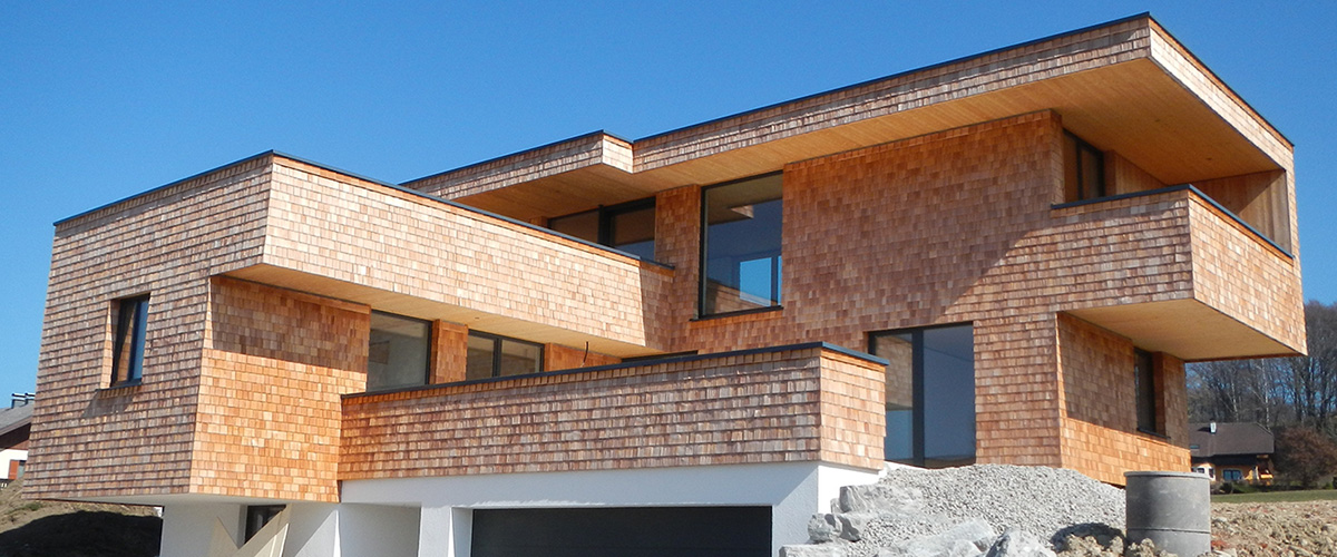 Moderner Holzriegelbau mit Flachdach und Lärchenschindelfassade